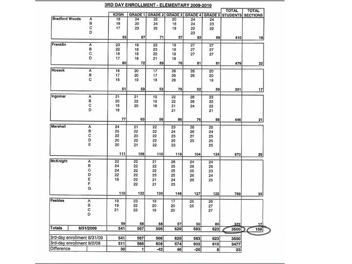 The projection model used by the district to make 5-year enrollment forecasts has consistently underestimated actual enrollment. In 2008, the district predicted an elementary enrollment of 3,182 students for the 2013-14 school year—400 students below the third-day enrollment of 3,582 students.