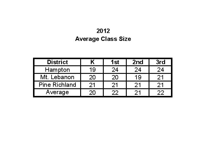 As you can see from the chart, the average 3rd grade class size at Pine-Richland is 21 students, the average 3rd grade class size at Mt. Lebanon is 21 students, and the average 3rd grade class size at Hampton is 24 students.