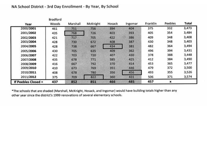 On Nov. 28, 2012, the administration presented a redistricting scenario that showed enrollment totals in the six remaining elementary schools if Peebles were to close.  Under this scenario, the average enrollment per building would be: